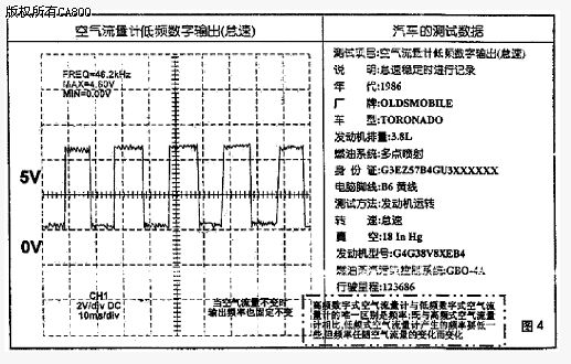 一些卡门涡旋式空气流量计经常安装在空气滤清器总成里,它们在数字式空气流量计中是一个例外,随着空气流量的变化不仅脉冲频率变化,而且脉冲宽度也变化。如果你遇上这种空气流量计,不必担忧。它可能工作很正常,加速时如果这些空气流量计工作正常,它的脉冲宽度将有次序、有规律地变化。这将给控制计算机提供异步加浓或额外喷射脉冲信号,用以改善加速性能。该传感器可以通过改变占空比进行模拟。