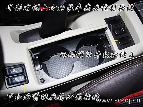 手刹旁边还设计了便于操控的座椅加热以及倒车感应控制按键,副驾驶也可轻松操作。预留的升级按键位置同样是两个。