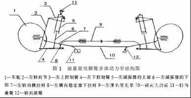 C型车前悬架采用双横臂式独立悬架。前悬架主要零部件,对整车操纵稳定性能分析有重要影响的有:上横臂(两个)、下横臂(两个)、转向节(两个)、转向横拉杆(两个)、转向主拉杆(一个)、转向摇臂(两个)、车身(一个)、横向稳定杆(一个)、纵置扭杆弹簧(两个)、减振器(两个)。上横臂一端通过球铰与转向节相连,另一端通过转动铰与车身相连,使其可相对车身上下摆动。下横臂一端通过球铰与转向节相连,另一端通过转动铰与车身相连。转向横拉杆一端通过球铰与转向节拉臂相连、另一端通过球铰与转向主拉杆相连,纵置扭杆弹簧一端通过固定铰与下横臂相连,另一端通过固定铰与车身相连。车轮(即hub构件)通过转动铰与转向节相连。稳定杆中部自由地支承在两个固定在车架上的橡胶套筒内。稳定杆连杆一端通过等速万向节与稳定杆连接,另一端通过球铰与下控制臂连接。具体结构简图见图1所示: