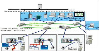 通过分布在涂装车间内或中控室的EMOS监控机可以方便地查看整个涂装车间工艺设备的运行状态,EMOS监控机所监控、显示的具体内容如下:各工艺设备动态工艺流程图;水泵、风机等的运行状态;温度、湿度和液位等工艺参数的动态值,以及历史曲线;故障报警,故障设备,故障地址显示,故障原因显示,记录涂装车间公用动力耗量并制成统计列表。监控系统结构图如图3所示。