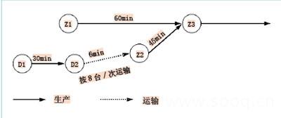 如图2所示,从Z1到Z3装配时间为60min,而D1点较Z1点提前60min获得排序信息,所以D1到Z3的产品生产周期必须小于120min,而Z2到Z3的生产时间为45min,所以从D1到Z2的生产(即动力总成分装完成送到Z2工序)时间必须小于75min。
