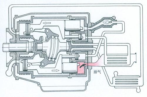 完成作功过程后,作功汽缸也转到与排气口相沟通的位置,汽缸中的高温废气在动力活塞作用下排出汽缸流向回热器,排气中的热量被回热器内的低温压缩空气充分回收。