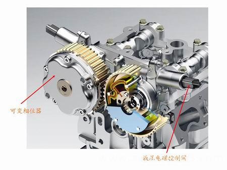 可变配气相位(VVT):可变配气相位(VVT)技术指的是发动机的配气相位可以根据性能需要适时的改变,即根据燃油经济性、动力性和排放控制的要求对不同的工况采用不同的气门正时相位,以达到进气系统的最优化,对降低发动机油耗、提高低速扭矩、改善功率特性有显著效果。此外,VVT技术在提高发动机性能的同时可以降低污染排放,从而取代或减少在排放控制零部件上的投入,甚至可以免去安装EGR、二次空气等装置就可以达到苛刻的排放法规的要求。发动机采用该技术可以达到增加功率、减少油耗,改善排放的目的。