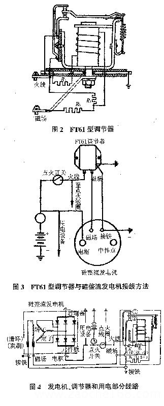 FT61型调节器与硅整流发电机的接线方法如图3所示。调节器、发电机的内部经路及用电部分线路如图4所示。工作情况如下: