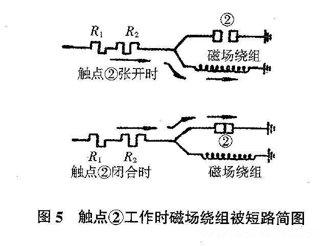 当第2对触点工作时,触点由张开转为闭合,发电机磁场由原来通过电阻R-1、R-2供给的激磁电流变为绕组被短路,激磁电流要消失。这时,磁场绕组中将产生自感电动势,由于原来的激磁电流就很小,所以这个自感电动势也很小,这个很小的自感电动势并通过已闭合的第二对触点放电。当触点再由闭合转为张开时,放电已接近结束,所以这时触点间也不会产生火花。