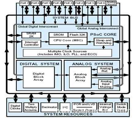 EZ-Color控制器是Cypress半导体有限公司生产的专门针对高亮度LED照明混色应用的可编程片上系统芯片。它主要由8位微处理器,可编程模拟模块和数字模块,外加硬件乘法累加器、I2C、闪存、SRAM等周边外围模块组成,如图1所示。
