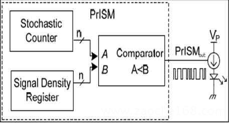 赛普拉斯的EZ-Color方案的亮度控制采用了赛普拉斯的专有的PrISM技术。相比于PWM控制方法它可有效地解决电磁干扰与低频闪烁问题。如图3所示,PrISM技术通过将随机计数器与用户所要求的信号强度寄存器的值进行比较,如果随机计数器里的值小于信号强度值时,就输出高电平信号,大的时候就输出低电平,从而产生高低电平宽度随机变化的精确照明脉冲信号。