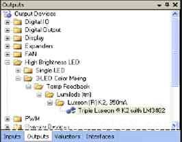 B. 从“输出驱动器”列表中的High Brightness LED下面选择“Triple Luxeon? K2”颜色混合驱动器,并将其拖到工作区中(见图5)。在拖到工作区释放后,PSoC express会弹出一个添加输出驱动器窗口。这个时候输入驱动器“ColorMixer”作为HBLED驱动名称后,点击“ok”即可。