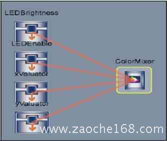 H. 定义输出与输入的传递函数关系:右击“ColorMixer”输出驱动器图标,然后选择传递函数打开传递函数对话框。在传递函数对话框里将作为输入的4个变量与输出传递函数的4个参数一一对应配置即可,一旦配置完后,如图9所示,输出与输入之间会显示连接线。