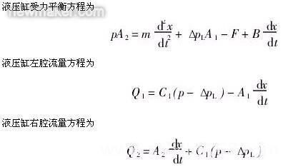式中:p为油源压力;ΔpL、ΔpR分别为开关阀L、R的压力损失;A1、A2分别为液压缸左、右腔有效工作面积;m为活塞移动部件质量;x为活塞位移;F为负载;B为粘性阻尼系数;Q1、Q2分别为液压缸左、右腔流量;Cl为液压缸内泄漏系数;k为复位弹簧刚度。