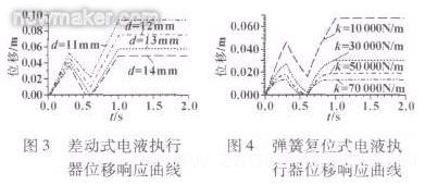 由图3可见,活塞杆直径d=12mm时,活塞左行与右行时的响应速度基本相同,此时活塞的最大位移为0.04m,活塞平均速度为0.13m/s。由图4可见,弹簧刚度越小,执行器右行时的响应速度越快(活塞移动相同距离所需要的时间越短),但左行时的响应速度越慢。相反,弹簧刚度越大,则执行器右行时的响应速度越慢,但左行时的响应速度变快。因此,弹簧刚度与执行器响应速度是一对矛盾,为兼顾活塞左行与右行时的响应速度,可取弹簧刚度k=50 000N/m,由图可见,此时活塞左行与右行时的响应速度基本相同,但活塞最大位移仅为0.018m,活塞平均速度为0.06m/s。