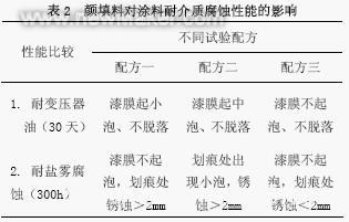 变压器油箱内壁涂料直接涂覆在油箱内壁的钢板上,要求涂料不仅具有耐油性,还要具有一定的防锈功能。本研究在选用树脂 c 为基料树脂的条件下,考察 了不同颜填料对涂料耐介质腐蚀性能的影响,结果见 表2。