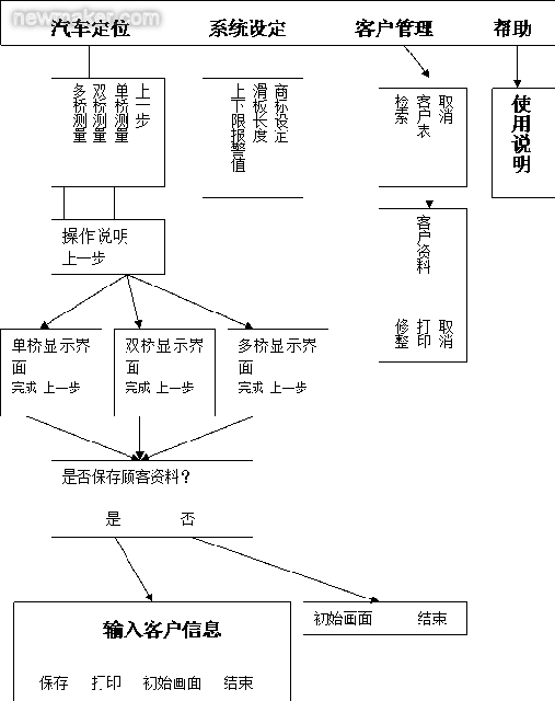 汽车定位:系统提供3种不同的汽车定位系统,分别为单桥定位,双桥定位和多桥定位,其中多桥定位需要检测6组车轮的侧滑量。