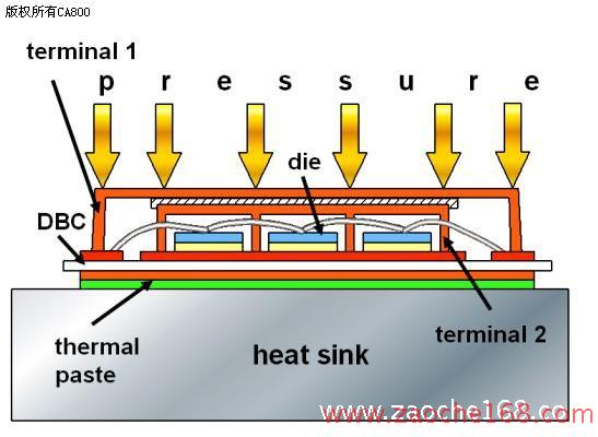 SKiiP模块中,使用机械压接系统将带有硅片的基板压置在散热器上。由于基板不是固定在散热器上,能够随着温度的变化而伸缩,不会产生可怕的机械应力。焊接上的芯片的连接非常的小,且对于硅片来说,基板的热膨胀系数是最合适的。因此基于这种技术的模块比常规有底板模块具有高得多的热循环能力。