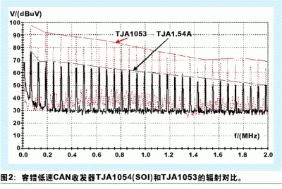 图2是采用飞利浦SOI工艺的TJA1054容错CAN收发器与采用传统BCD工艺制造的前代TJA1053的辐射对比。在抗干扰的同时,辐射平均减少了20 dB以上。这在EMC性能方面堪称“石破天惊”的改变,即使在复杂的网络架构中也无需屏蔽电缆,因而有效地节约了成本。
