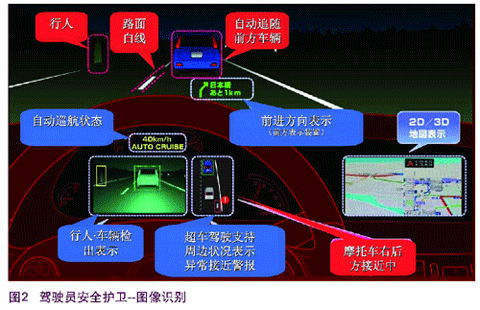 未来车载安全系统还将搭载行车线及前方车辆识别照相机、红外线照相机、后方车况照相机、瞬时检验照相等技术装置。为提高安全性,一辆车将装载10台以上的照相机。现在汽车厂商正在开发车内监控摄像头的打瞌睡检测和警报装置,及在前方有监控摄像头时的驶离车道报警等技术(图2)。