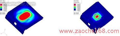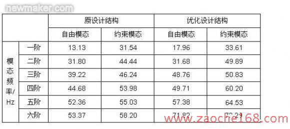 为了验证优化结果的可行性和有效性,对优化后的结构进行了和优化前结构相同的载荷和边界条件强度和模态分析。分析结果见表。可以看出,优化后的结构最大应力由原来的598.00减小为152.23Mpa,应力减小了近 3倍,强度满足设计要求。形变位移由原来的26.20mm,减小为 6.21mm,形变位移减小了近 4倍。从上面的比较可以看出,优化后的后掀门结构强度和刚度都有显著提高,从而满足设计要求。