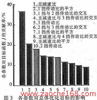 图3显示了各参数对优化目标的影响程度,图4显示了各参数对汽车燃料经济性目标的影响程度,图5显示了汽车燃料经济性的寻优过程,表1列出了优化前后汽车各挡速比、汽车动力性以及燃料经济性的对比。为了研究优化目标函数中比例因子α对结果的影响,表1中列举了α分别取0.8和0.85时的优化结果。