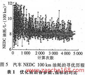 另一方面,从表1中可见比例因子α对优化结果有一定的影响:α取0.8更偏重于燃油经济性;α取0.85时更偏重于动力性能,因此目标函数中比例因子的大小需根据汽车整车性能特征需求进行选择确定,以得到满意的燃油经济性和整车动力性能的最佳平衡。