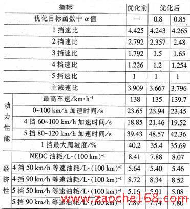 动力性目标权值越大,对变速器各挡时发动机的后备功率要求就越高,优化得到的传动系统传动比数值较高,汽车的燃料经济性通常相对不佳;反之,动力性目标的权值越小,变速器对应各挡时发动机的后备功率就越小,优化后的传动比数值较小,汽车的燃料经济性变好,但动力性则变差。