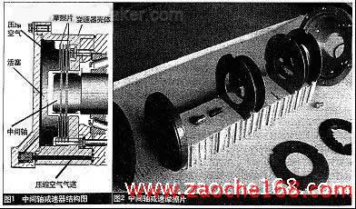 从低档换入高档时,需降低被换档齿轮的速度,同时中间轴亦要降低速度。中间轴降低速度后,将使被换档齿轮上结合齿圈与结合齿套内外花键齿同步,达到换档目的降低中间轴速度是通过安装在中间轴前端的中间轴减速器的制动(见图1)作用完成的。中间轴减速摩擦片(见图2)有2片,一片固定在中间轴一端另一片固定在滑动活塞上,活塞与变速器壳体相对固定不能转动,只可轴向移动。轴向移动时可使2片摩擦片接触,产生制动力降一低中间轴速度。中间轴制动只有在低档换入高档时起作用。