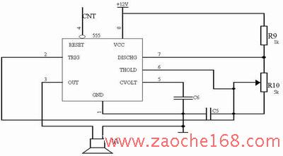 本设计采用第一种方法产生超声波,电路设计如图2所示。40kHz的超声波是利用555时基电路振荡产生的。其振荡频率计算式为f=1.43/((R 9+2·R 10)·C 5)。将R 10设计为可调电阻的目的是为了调节信号频率,使之与换能器的40kHz固有频率一致。为保证555时基具有足够的驱动能力,宜采用+12V电源。CNT为超声波发射控制信号,由单片机进行控制。
