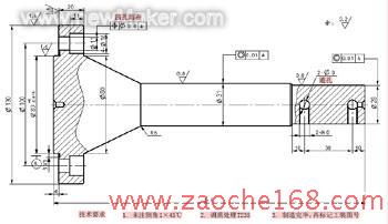 由于精镗销孔是高速切削加工,轻微的振动将直接影响活塞销孔的表面粗糙度,因此,在镗杆设计制作时要求镗杆与主轴的同轴度小于0.01mm,且整个镗杆各部外圆都要进行磨削加工。这样就保证了镗杆在高速转动中可保持平衡、减少振动,消除了镗杆本身的影响因素。刀孔的位置直接影响装夹后刀具的加工角度,因此在镗杆设计时(见图2),要求刀孔中心经过镗杆中心或刀孔中心偏离镗杆中心一定距离,且刀孔中心垂直于镗杆轴线,保证装夹后刀具的加工角度;同时,给定相应各部的形位公差,减少因镗杆替换引起销孔加工表面粗糙度的变化。销孔加工的镗杆一般悬臂较长,因此镗杆必须进行稳定强化热处理,这样可以提高镗杆的强度、刚性,减少镗杆的受力变形,提高活塞销孔表面粗糙度水平。