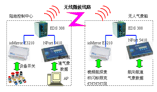 系统应用描述: 在地面控制中心,各种设备的开关接在ioMirror E3210的DI输入端,通过无线微波的方式与无人气象船建立通信链路,借助于ioMirror E3210的Peer to Peer 的功能,与安装在船上的另一台ioMirror E3210来控制船上各种信号灯。无需PC,无需编程,就可以通过无线网络对无人气象船上的各种灯光信号进行控制。