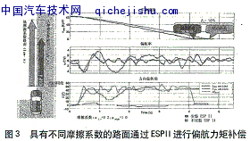 对车辆本身来说,一方面存在的稳定性和可控性之间的矛盾冲突,另一方面要求制动时有较短的制动距离,使用传统的方法解决此问题时比较困难的,在GCC中,采用了主动转向干预的方法来解决,其结果可参见图3。由于较小的摩擦系数,由车辆两侧车轮制动力不同引起的偏航力矩不能通过在较小摩擦系数一侧增加制动系统的压力来补偿,惟一可选择的解决方法就是通过反向转向提供额外的侧向力。使用ESP II,通过驾驶员独立的主动转向干预来实现反向转向,在此过程中,需要驾驶员能够连续地进行转向,通过转向干预实现的偏航力矩补偿也意味着在前轮和后轮的制动压力的建立过程中实际是没有延迟的,这样,制动距离就大大的缩短了,可以缩短10%之多,这取决于车轮两侧摩擦系数的差值和传统的ABS/ESP的配合。因此,制动系统和转向系统都能保持它们的最原始功能:制动系统缩短制动距离,而转向系统实现反向转向。