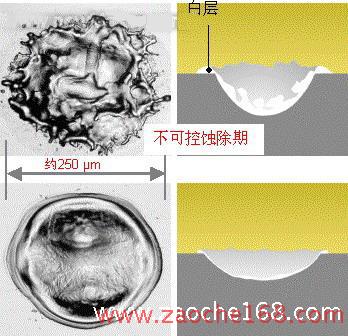 瑞士AGIE的研究结果表明:单个脉冲的微观放电加工过程拌随脉冲电压击穿介质形成等离子束产生的高温汽化熔化导电加工体形成蚀除坑穴(简称蚀坑),等离子束半径增大蚀坑半径随之增大。当达到热平衡半径增大停止,处于“渐进状态”,“渐进状态”是最低电极损耗和最大蚀除率也是停止脉冲电压的最佳时刻,此时产生的蚀坑表面质量好,相同的放电间隙放电能量最经济,减少精加工的时间(图2)。
