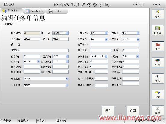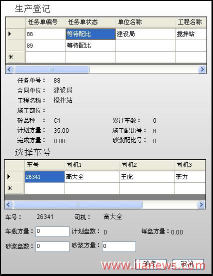 针对每次生产任务,填写相应的生产任务单,生产任务单中包含任务单编号、任务单状态、合同编号、混凝土品种、运送车队等基本信息。任务单管理功能提供了新增、删除、修改、查询等功能。编辑完成的生产任务单保存在与易控相连的数据库中,用户可通过生产画面的“生产登记”按钮进行选择。