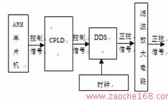 采用DDS技术在当前的测试测量行业已是一种主流的做法[6],其频率精度可随相位累加器的位数而定。本系统采用单片机+专用DDS芯片的方式产生正弦信号,其原理如图4所示,ARM单片机向CPLD 发出控制命令,CPLD 在时钟下译码后产生DDS的控制信号,产生出相应频率的正弦波信号,该正弦信号经过滤波放大后,输出相应幅值的正弦信号。