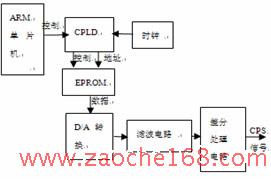 曲轴位置信号(CPS)是PCM控制点火系统中最主要的传感器信号,为适应多种PCM的需求,设计采用CPLD和DA的方式产生。CPS信号产生原理如图5所示,在EPROM中存有一个周期的正弦表数据,当需要产生CPS信号时,ARM单片机对CPLD进行设置,CPLD根据接收的控制命令,通过时钟计数,产生读存储器的信号,并向EPROM提供合适的地址信号和控制信号,EPROM输出相应地址的数据,经D/A转换,变成单端CPS模拟信号,然后经滤波电路和单端转差分处理电路,输出CPS差分信号。在实际的电路实现中,对CPS信号的控制可由计算机通过CAN总线向ARM发出控制命令进行设置,因此,即使ARM芯片在运行过程中复位,电路仍能输出正确的CPS信号,以确保测试周期的正常进行。