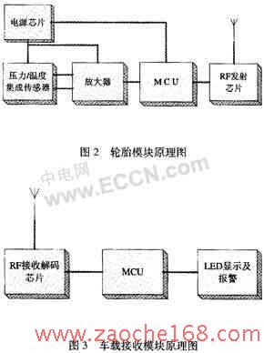 该系统的基本工作原理如下,把轮胎模块装置在轮胎内,压力和温度传感器检测轮胎内部当前的应力和温度信息,获得的模拟信号经过A/D变换器转换成数字信号,然后通过射频发射器发送出去。车载接收模块装置在驾驶室内,射频接收器接收来自轮胎模块的应力和温度信息,当轮胎压力过高或者过低时,通过显示和报警装置发出报警信息。