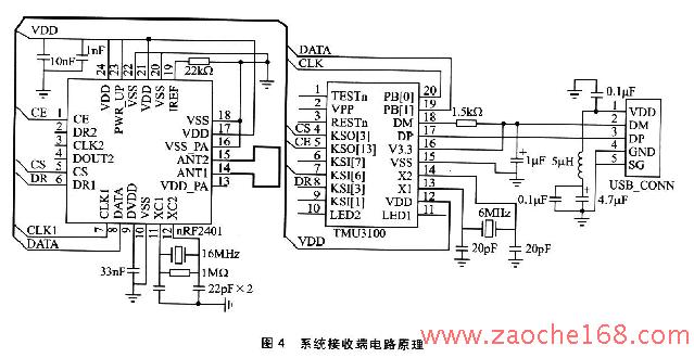 图4是系统接收端电路原理。由于TMU3100由PC供电,而PC机USB接口所提供的电压VDD干扰较大,故对VDD进行了π滤波。