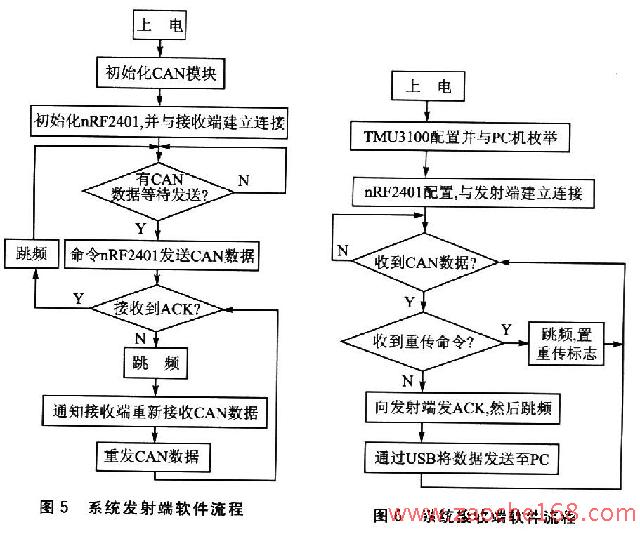 上电后,首先对CAN模块进行初始化。然后初始化nRF2101,并与接收端建立连接。当发送完CAN数据后没有收到ACK信号时,就跳频;然后通知发送端准备接收重发的CAN数据,直到接收到ACK信号。