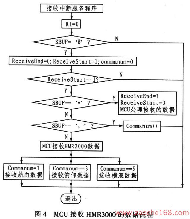 启动HMR3000后,设定好HMR3000的数据单位、进制及其数据采集速率,每次数据采集后HMR3000自动向MCU发送数据。由于它采用NMEA0183协议标准的HPR格式即“$PTNTHPR,x..x,a,x..x,a,x..x,a*hh”格式输出,此格式中不仅含有效数据“x..x”和其状态“a”,还包含有‘$’、‘P’、‘T’、‘*’、‘h’等相关格式字符,因此在程序中要加以区分。动感系统中将字符‘$’作为一组有效数据传输的开始,将字符‘*’作为一组有效数据传输的结束,并通过计算接收逗号‘,’的个数判断有效数据的开始。MCU接收HMR3000的数据流程如图4所示。