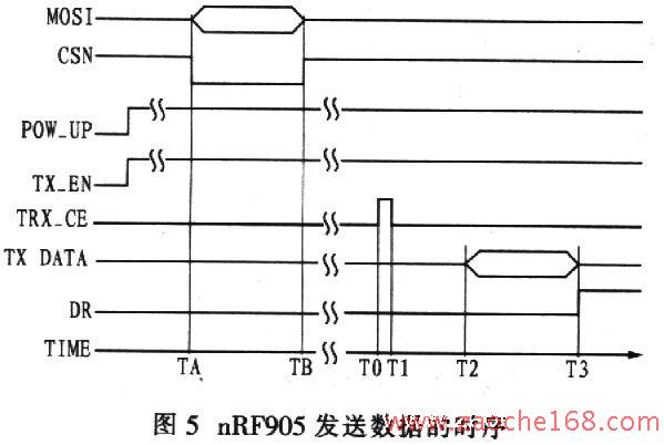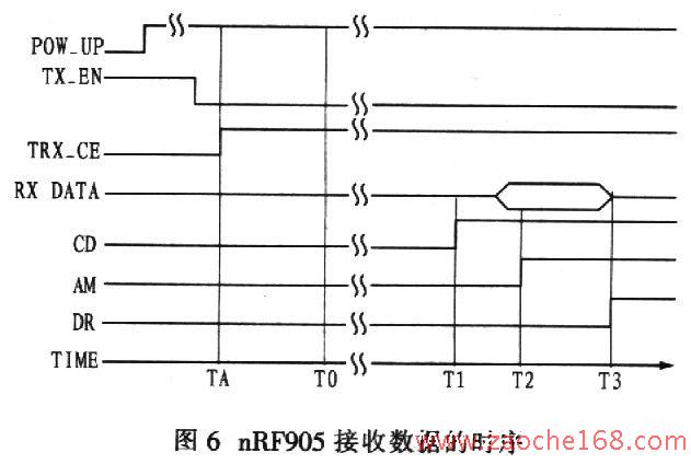 (1)给nRF905上电后,MCU通过将TX_EN置低电平和TRX_CE置高电平,使nRF905进入接收模式(图6中的TA时刻);