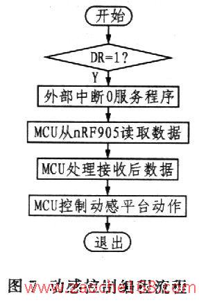 根据硬件电路的连接,可以利用外部中断0服务程序实现动感的实时控制,这样,MCU在DR变成高电平后即可控制动感平台动作,提高了实效性。程序流程如图7所示。