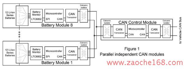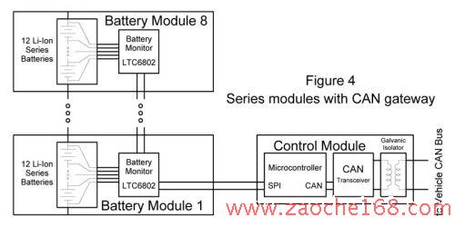每个由12个电池组成的模块都含有一个电路板,板上有LTC6802和数字隔离器。这些模块与控制器电路板有独立的接口连接,控制器电路板上含有微控制器、CAN接口和电流隔离变压器。微控制器协调这些模块并提供到汽车主CAN总线的网关。