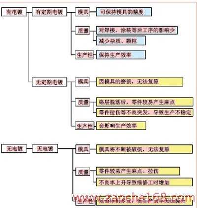 模具表面进行硬质铬电镀后,有以下几个优点:表面硬度将提高至HV800~HV1000;滑动性能提高(镀铬后需打磨);防锈效果良好;另外,零件产生麻点率也将降低,由于铬层厚度一般可以控制在十几个微米以内,因此对模具精度也不会产生影响,当使用较长时间出现脱落后,还可以脱铬进行再电镀,从而持续保证模具表面品质。当然,由于大型模具的镀铬技术仍只被少数国外企业所掌握,镀铬费用比较昂贵。从使用情况来看,定期镀铬、不定期镀铬及不进行表面处理在模具磨损情况、零件品质及生产停机等方面存在一定差别(见图3)。