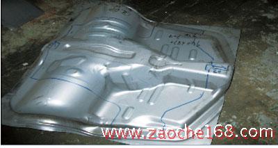 采用左右件共模生产不但更利于材料的成形,重要的是要比单件生产更能发挥节材效能。我公司在对图4所示零件的冲压工艺选择上,最初仅从成形性上选择而没有充分考虑到成本控制方面的因素,采用左右件分别拉伸成形,材料利用率为42.4%,而日本铃木采用左右件共模拉伸,材料利用率为55.6%,相对高出13.2%,每生产一件(左或右)要少消耗材料2.41kg,少开发4套模具,减少了工序数,降低了设备及人员的占用和资源消耗等。从成本控制的角度来看,两种方案的优劣比较明显。