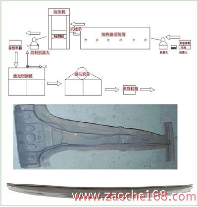 随着强度的提高,钢板成形性能总体上呈下降趋势,形状冻结性变差,成形难度加大。同时材料成形力也增加,造成成形负荷增大,工具、模具的磨损和损坏严重,所以,近年正在开发热冲钢板(见图3)。例如含B钢板,将其加热到900℃左右进行冲压变形,大幅度降低成形力,提高材料的成形能力,冲成零件后,立即利用余热进行淬火处理。目前处理后的抗拉强度可以达到1500~2 000MPa。处理完的零件要经过喷丸处理,以消除氧化铁皮,改善表面质量。
