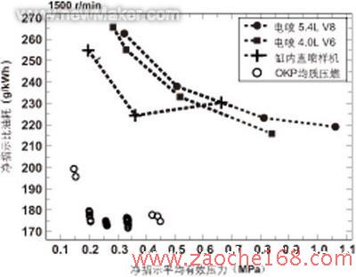 发动机台架实验也证明,适当设计的均质压燃汽油机确实能够大幅度降低发动机部分负荷的油耗。图2所示为一台OKP型均质压燃汽油机、两台常规电喷汽油机及一台分层燃烧缸内直喷汽油机样机在1500r/min转速下不同负荷的指示比油耗。测试方法和数据处理方法相同。可以看到,OKP型均质压燃汽油机大幅度降低了部分负荷油耗。