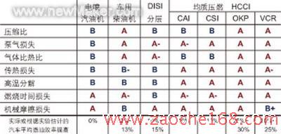 从理论分析角度,恰当设计的均质压燃汽油机可以大幅度降低部分负荷工况的油耗。影响活塞式发动机热效率主要有7个因素,如表所示。根据这7个因素对不同的发动机进行评价(A优于B)。OKP型汽油机在每个方面都属于较好的A组,已接近活塞式发动机部分负荷热效率在技术上的上限。