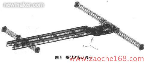 如图3,约束4个支腿端部接触面的Y方向移动、绕x及z轴转动自由度。为消除结构刚体位移,选择支腿底面,通过建立固定的多点约束,约束x,z方向的移动自由度,具体计算时,先按4个支腿全部工作时考虑,即对4个支腿全部加约束,倘若出现某一个支腿反力方向垂直向下(即Y沿轴的负方向),则表明此支腿在实际工作时已离开地面,故必须解除其约束,重新计算,模型加载及约束情况如图3。