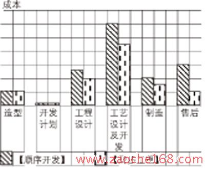 同步工程要求设计人员在造型阶段就要开始综合考虑产品生命周期的各个方面,包括产品定位、市场需求、成本、产品性能(可靠性、安全性、动力性、经济性和舒适性等)、工艺性、质量控制及报废与回收等。这就要求各专业人员及时提供各方面的意见,以便系统地考虑设计方案,在产品设计阶段时作出正确的工程决策,把错误和缺陷消除在设计阶段,从而提高设计质量,降低项目后续开发成本、制造成本及售后服务成本。顺序开发与同步工程成本的比较如图2所示。