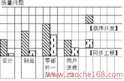 在同步工程中,设计、制造、质量控制和销售等不再作为相互独立的过程,而是作为一个系统的有机组成部分。项目组是该系统的组织模式,项目目标是将上述各过程联系在一起的纽带。为了共同的目标,各相关职能在开发过程中遇到复杂问题能够及时沟通信息,寻求最佳处理方案,有效地提高工作效率和产品质量。顺序开发与同步工程质量问题的比较如图3所示。