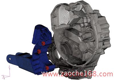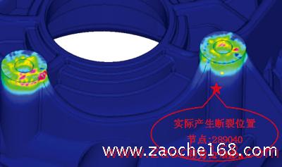 某车型在道路试验中,在完成一定行驶里程的例行检查时,发现变速器右箱体与后悬挂连接的螺栓安装凸台断裂(见图1)。初步判断是变速器上凸台强度不够,导致断裂;技术人员提出增加加强板,并对断裂处安装座凸台进行局部加筋,以加强强度。为了对断裂原因进行进一步的分析探讨,需要对变速器右箱体与后悬挂连接处安装座进行有限元分析。采用工程简化,只考虑后悬置处支架的支反力和断裂处安装座凸台处的螺栓预紧力;通过n进行求解,对比分析了变速器右箱体与后悬挂连接处安装座凸台的应力分布情况,并单独对连接处安装座凸台位置所需的螺栓预紧力进行了分析对比。通过分析,排除了安装凸台断裂是由于安装座凸台本身强度薄弱引起的意见。并通过试验与分析的对比研究,找到了断裂的可能原因。