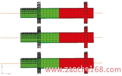 变速器右箱体的左侧端面通过螺栓与左箱体相连,右侧端面通过螺栓与发动机缸体连接,同时右箱体上的凸台通过螺栓与后悬置支架连接。考虑一定的分析简化,变速器只取右箱体,后悬挂只取与变速器右箱体相连接一侧的支架,右箱体与支架通过3颗螺栓连接。